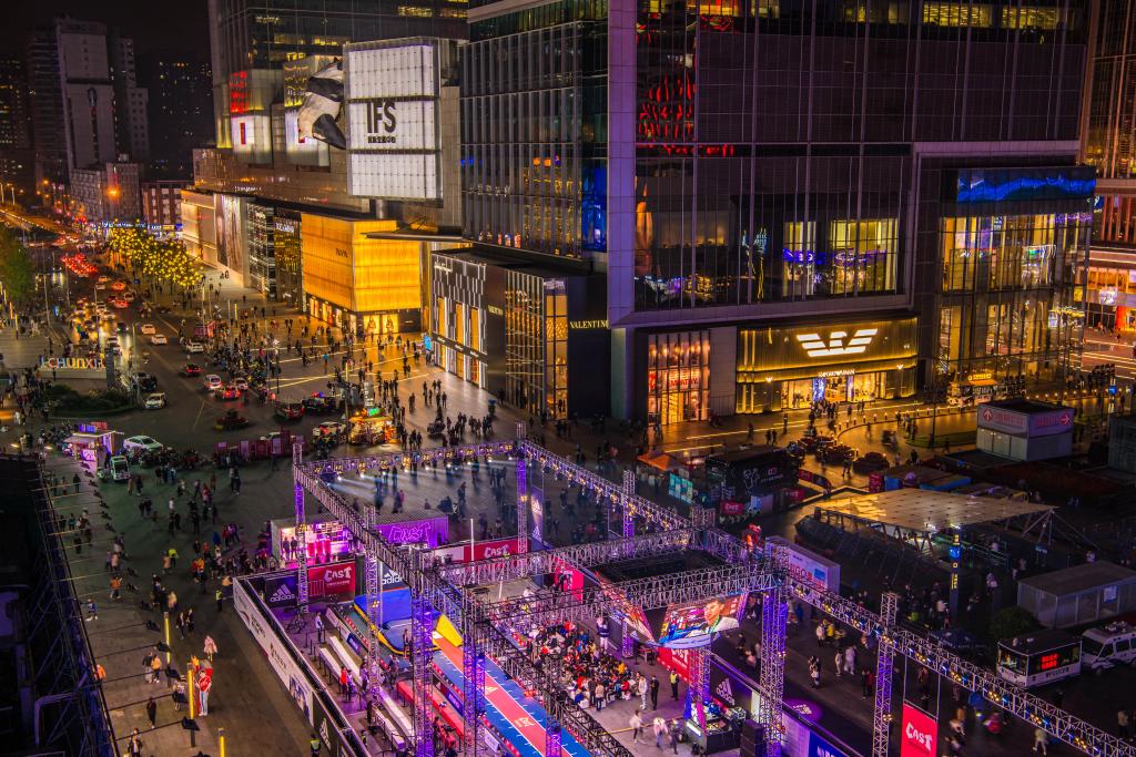 2020年10月29日拍摄的中国田径街头巡回赛成都站比赛现场。当日,中国田径街头巡回赛成都站撑杆跳高比赛在成都春熙路举行。新华社记者江宏景摄