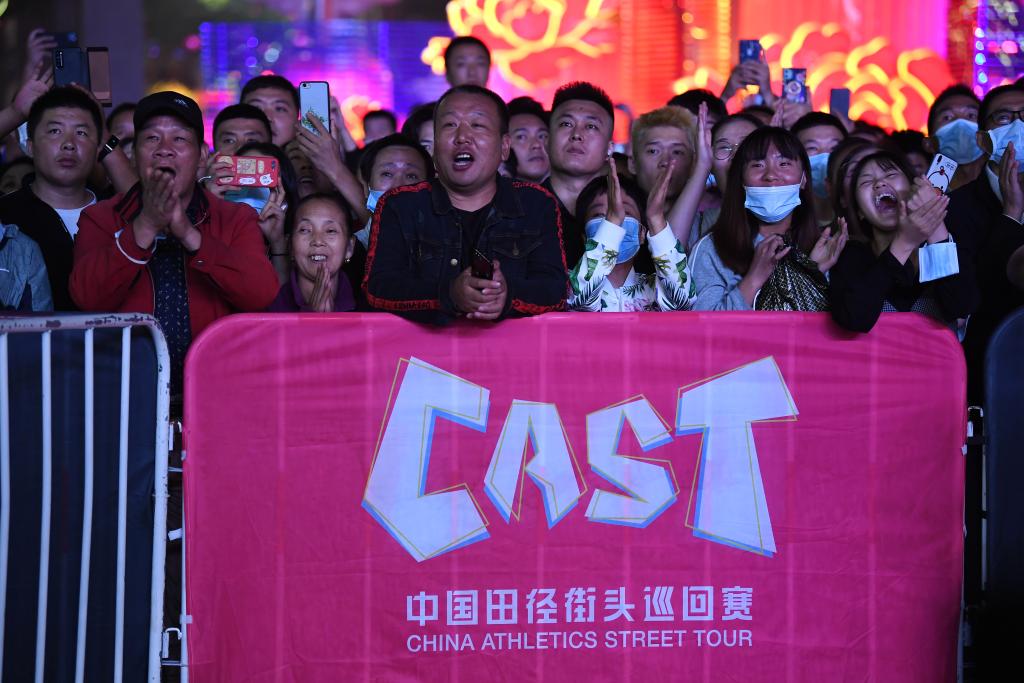 2020年9月28日,观众在现场为选手加油。当日,中国田径街头巡回赛西安站男子撑杆跳高比赛在西安大唐不夜城开元广场举行。新华社记者李一博摄