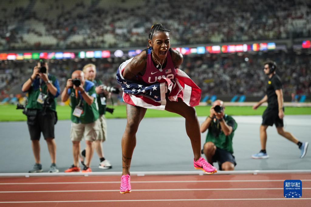 8月21日,理查德森在比赛后庆祝。新华社记者 郑焕松 摄