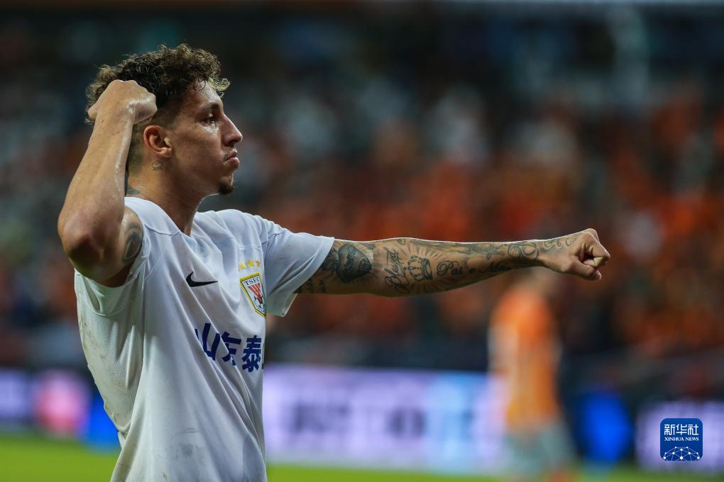 8月25日,山东泰山队球员克雷桑·巴塞洛斯在比赛中庆祝进球。新华社发(彭志刚摄)