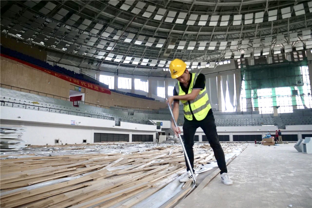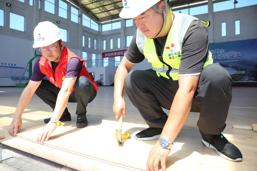 2020年9月,浙建集团浙江一建亚运项目团队为汾口中学体艺馆安装木地板。(浙江一建 供图)