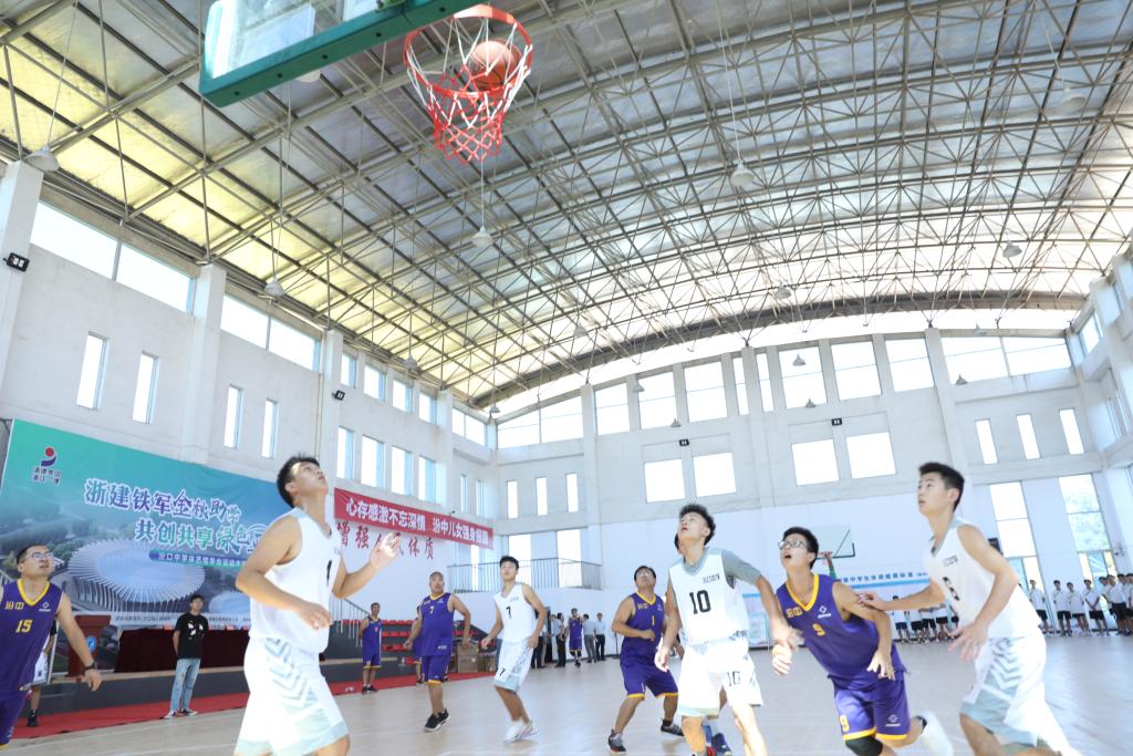 2020年9月7日,汾口中学学生在体艺馆铺设一新的木地板上打篮球。(浙江一建 供图)
