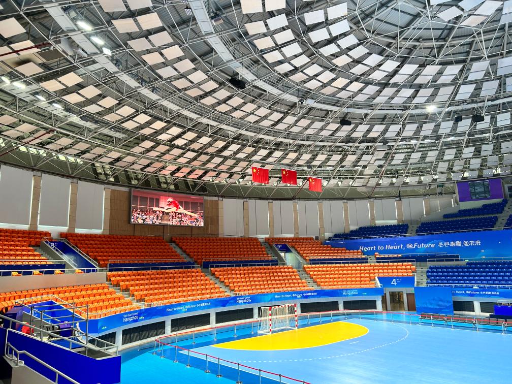 按照亚运会赛事要求,之前的地板回弹率不达标,因此场馆内需要新铺设更为专业的运动地板,铺有双层龙骨和弹性胶垫,具有良好的弹性减震作用和吸收冲击能力,在身体碰撞激烈的手球比赛里可以更好地保护球员安全。