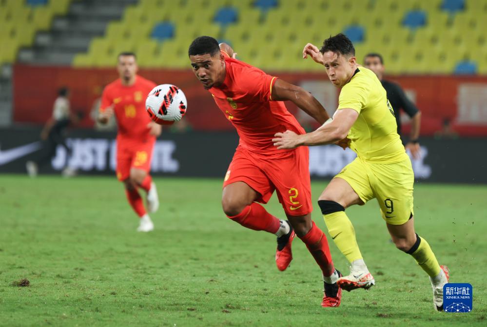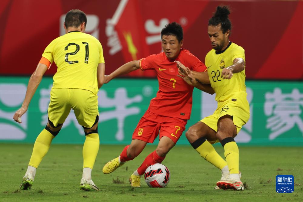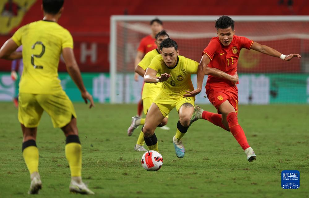 9月9日,中国队球员武磊(中)与马来西亚队球员科尔宾·翁(右)在比赛中拼抢。