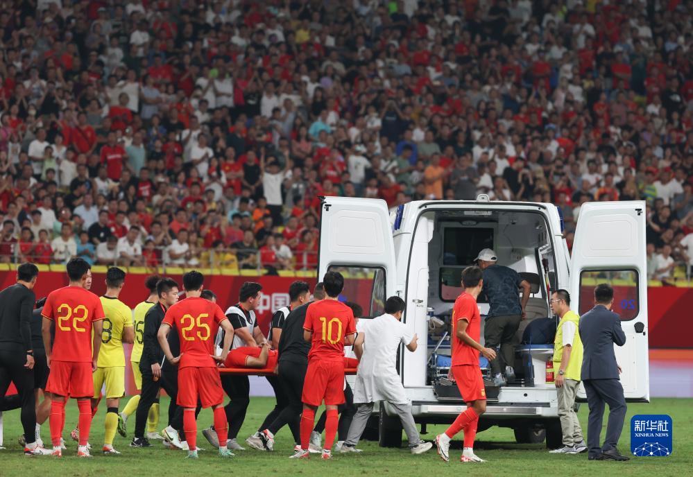 9月9日,中国队球员李帅在比赛中受伤,被送上救护车。