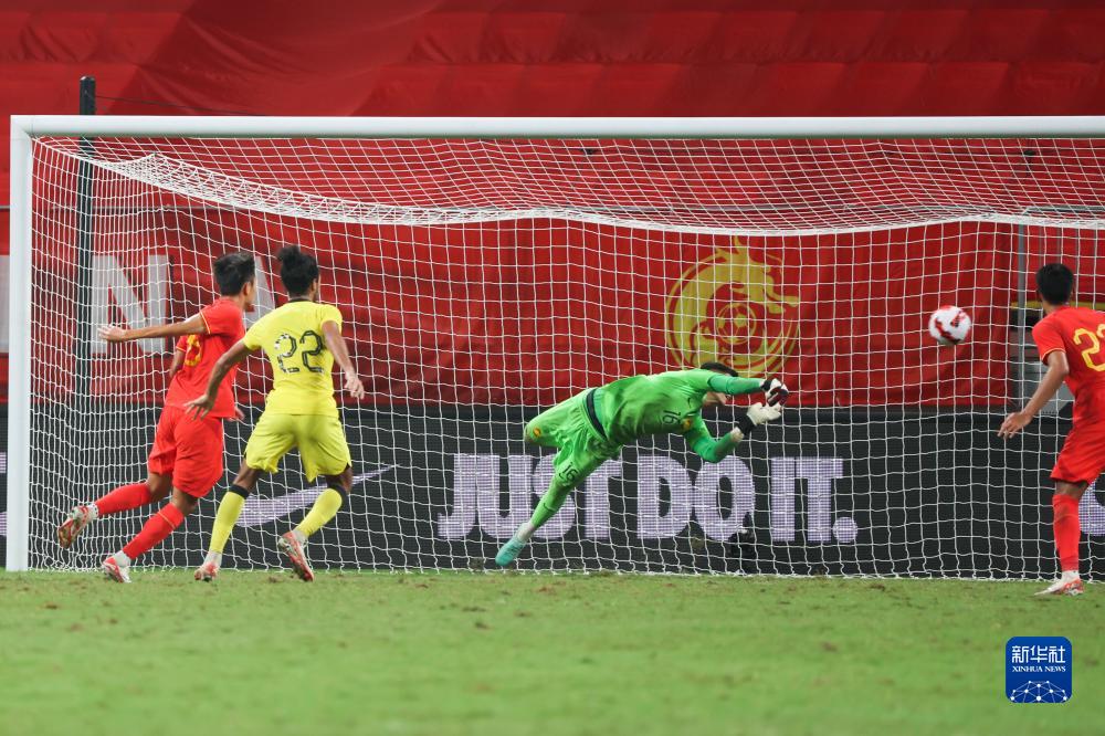 9月9日,马来西亚队门将西汉·哈兹米(右二)在比赛中扑救。