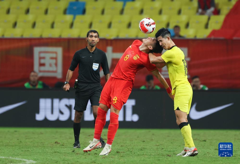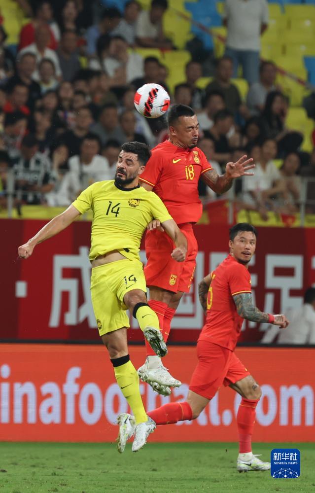 9月9日,中国队球员李可(中)与马来西亚队球员保罗·乔苏(左)在比赛中拼抢头球。