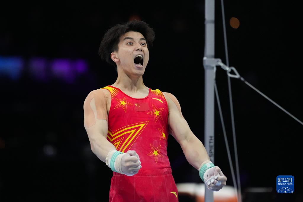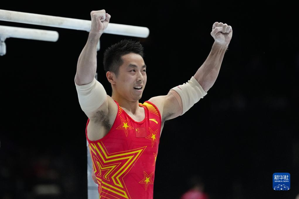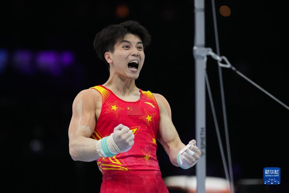 10月3日,中国队选手尤浩在双杠项目比赛后庆祝。新华社记者 郑焕松 摄