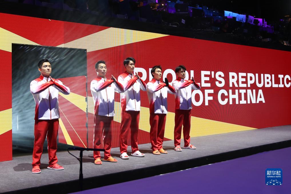 10月3日,中国队选手侍聪、刘洋、孙炜、苏炜德、尤浩(从左至右)在颁奖仪式上。新华社记者 郑焕松 摄
