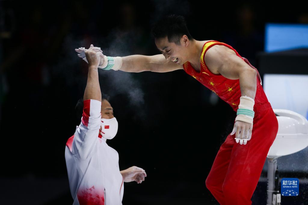 10月3日,中国队选手孙炜(右一)在鞍马项目比赛后与教练拥抱庆祝。新华社记者 郑焕松 摄