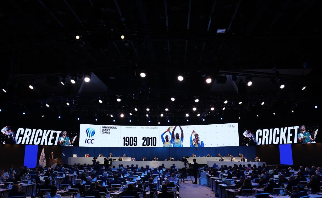 这是10月16日在印度孟买举行的国际奥委会第141次全会现场大屏幕展示的板球项目。新华社记者 曹灿 摄