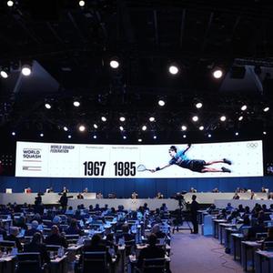 这是10月16日在印度孟买举行的国际奥委会第141次全会现场大屏幕展示的壁球项目。新华社记者 曹灿 摄