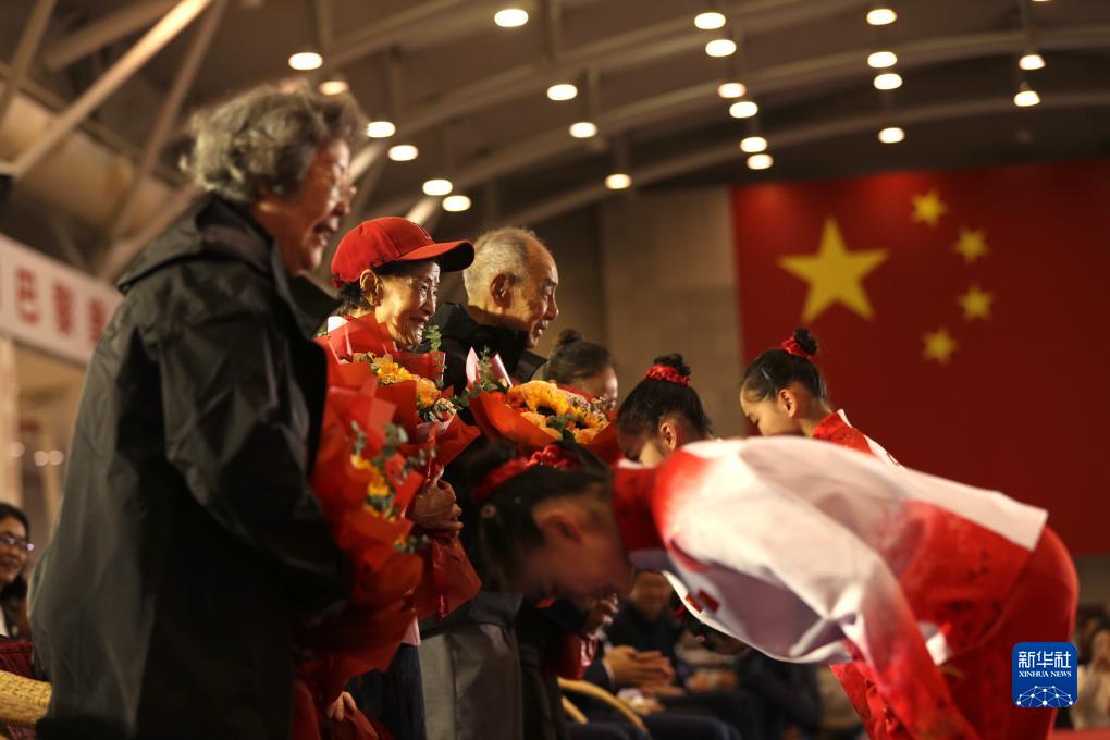 11月17日,现役国家队的小队员向国家体操队老前辈献花。新华社记者 许雅楠 摄