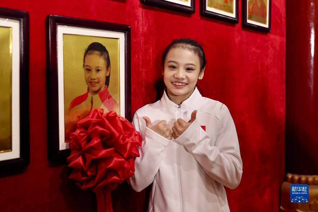 11月17日,体操运动员邱祺缘与世界冠军榜上自己的照片合影留念。邱祺缘获得2023年安特卫普体操世锦赛高低杠项目金牌,成为中国体操队新的世界冠军,光荣登榜上墙。新华社记者 许雅楠 摄