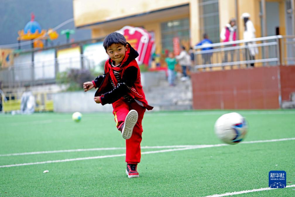 一名学生午饭后在贵州省大方县元宝同心实验学校的操场上踢球(2023年10月24日摄)。