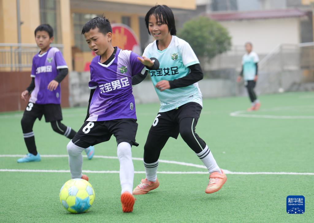 在贵州省大方县元宝同心实验学校,男足队员和女足队员在训练赛中拼抢(2023年10月24日摄)。