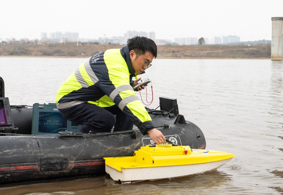 1月29日,在沪昆高铁湘江特大桥桥下,铁路工人操作无人测量船准备检测河床情况。