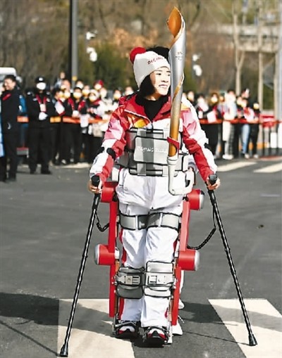火炬手杨淑亭佩戴动力外骨骼参加火炬传递。新华社记者 夏一方摄
