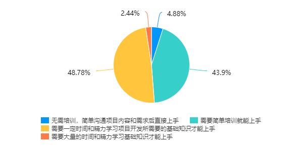 2015年中国政府发布了《国务院关于积极推进“互联网+”行动的指导意见》,推动建立以互联网为基础设施和实现工具的经济发展新形态。在这个新经济模式下,互联网企业被赋予了更多科技创新的期望。由图1所示,本研究对在中国运营的41家互联网企业展开调研,其中51.2%的企业表示新员工需要一定时间和精力学习项目开发所需要的基础知识才能上手工作,其余企业表示他们的新员工可以不经过培训或简单沟通就可以接手工作。数据说明,高校教育和企业需求存在着相当大程度的不适配性,在互联网领域这是一个较为明显的问题。