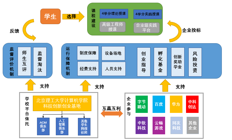 企业参与机制是“企学创”融合发展平台的鲜明特征和重要支撑。北京理工大学计算机学院与字节跳动、华为、百度等行业知名企业达成战略合作协议,共同建设合作“平台”。并以计算机学院学生创新创业基地为依托,由企业负责技术指导,建设了ACM俱乐部、人工智能俱乐部等高水平创新实践学生社团。通过课程共建、奖学金激励、科技竞赛检验、实习实践培训等方式拓宽合作渠道。为了解决学习方法的不匹配问题,“平台”与连山科技公司联合举办“编程大赛”,与字节跳动公司联合举办“人工智能大赛”,与云畅游戏公司联合举办“游戏设计大赛”。通过竞赛不仅激发了学生对科技创新的兴趣,检验了学生的创新能力,还为企业选拔优秀人才从事企业核心技术研究提供了路径。同时,基地鼓励学生在课程作业的基础上继续探索和研究,形成毕业设计方案。企业积极为学生提供毕业设计和专业实习相结合的机会,鼓励学生以工业产品、工程项目实践为主题撰写论文。