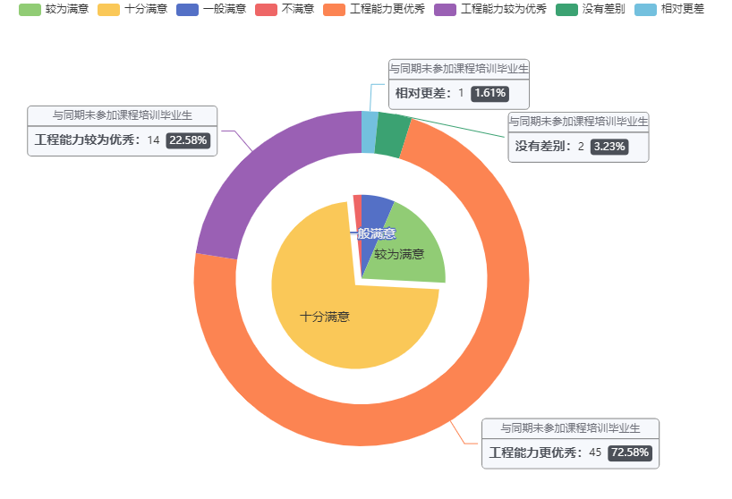 针对62名毕业进入互联网单位就业工作的学生,北京理工大学计算机学院进行了为期两年的跟踪调研,与相应就业单位联系并进行问卷调研,如图7所示。结果显示:72.58%的单位对参与课程毕业生表示满意,19.35%的单位表示较为满意,其中95.16%的用人单位认为参与过课程培训毕业生比同期北理工未参加课程毕业生工程能力优秀、更符合企业人才招聘需求。