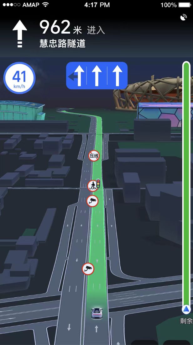 这同时也是一个为用户体验取舍权衡的过程:对于道路岔标线,以及周边地标等导航过程中的核心信息,新一代高德导航产品借助3D道路建模、数字参照物,基本上实现了真实世界在导航界面中的精准具像化。