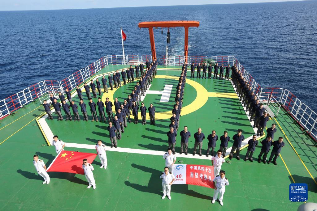 11月10日,中国第40次南极考察队在“雪龙2”号上排列成“40”字样的队形合影留念。新华社记者 周圆 摄
