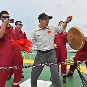11月10日,中国第40次南极考察队在“雪龙2”号上举行穿越赤道纪念活动。图为考察队副领队魏福海敲锣宣布拔河比赛开始。 新华社记者 周圆 摄