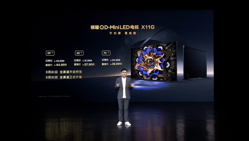 价格方面TCL Q10G Pro 98/85/75/65/55吋的新品首发价格为21999/10999/8499/6499/4499元。TCL领曜QD-Mini LED X11G共有98/85/75吋三个尺寸,价格分别为44999/27999/19999元。