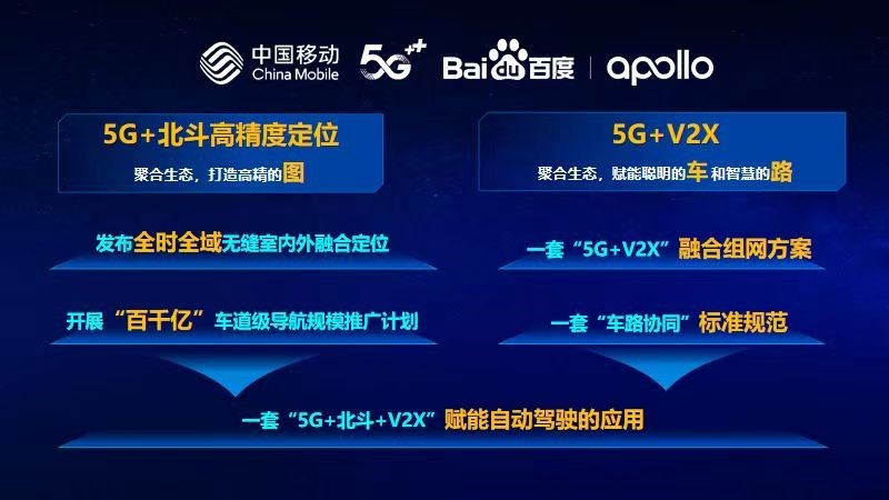 发布会上,中国移动上海产业研究院与百度Apollo签署战略协议,双方将聚焦5G、北斗、车联网、智能驾驶、信息服务、地图等领域的优势,开展技术标准、产品研发、应用合作、市场推广等四个层面全方位战略合作,共同发力,引领交通行业发展。在5G+北斗高精度定位领域,双方共同发布了全时全域无缝室内外融合定位方案、车道级导航“百千亿”规模应用推广计划。在5G+V2X领域,双方将围绕“三个一”展开深度合作,即围绕一套“5G+V2X”融合组网、一套“车路协同”标准规范,打造一套“5G+北斗+V2X”赋能自动驾驶的应用。