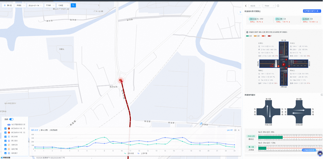 通过高德评诊治系统的“路口诊治”功能,能够根据路口车辆通行情况的变化,识别不同时间段的需求。系统综合分析排队长度、延误指数、停车次数以及路段车速等多维度数据,精确“诊断”各个时段的路口交通问题,并提出配时方案优化建议。此外,系统利用人工智能自动生成效果评估报告,为路口交通管理供科学数据支撑。