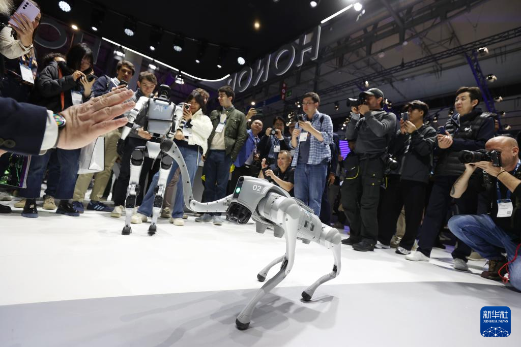 3月3日,在西班牙巴塞罗那举行的2025年世界移动通信大会上,人们观看机器狗演示。