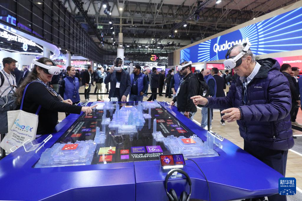 3月3日,在西班牙巴塞罗那举行的2025年世界移动通信大会上,人们体验头显设备。