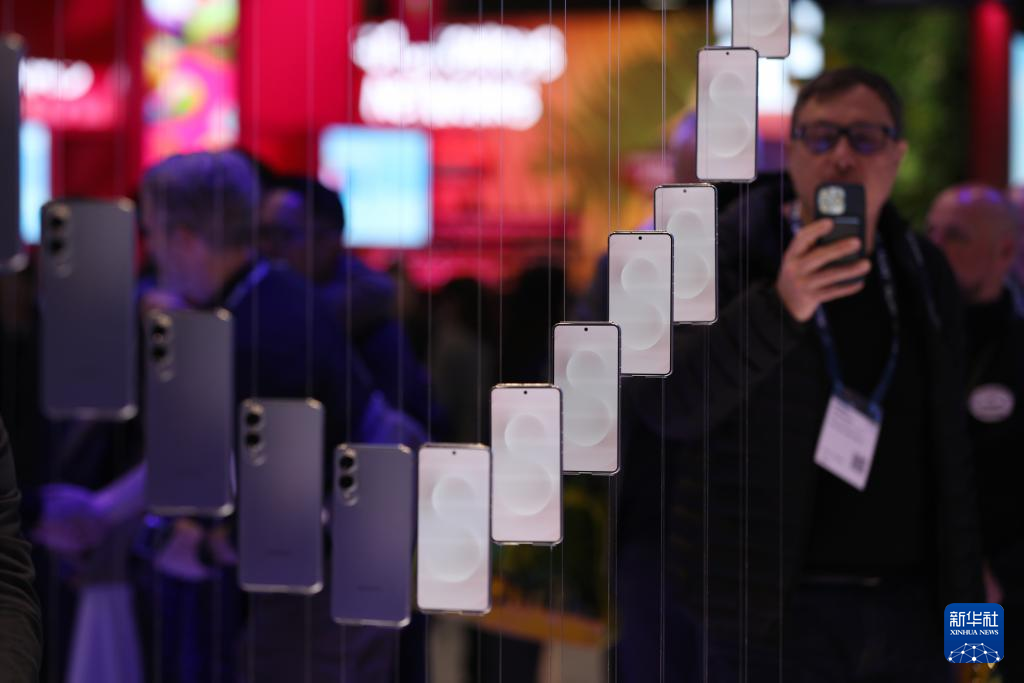 3月3日,在西班牙巴塞罗那举行的2025年世界移动通信大会上,参观者拍摄手机展品。