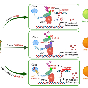此项研究中,团队系统分析和比较了柑橘“近亲”和“远亲”的遗传信息,并在柑橘“远亲”花椒等植物中发现一种蛋白PUB21DN,它能有效保护“免疫指挥官”MYC2蛋白不被降解,从而持续激活植物的防御系统。