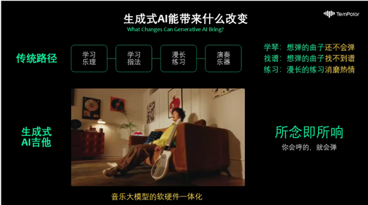 用户不再需要反复练习复杂和弦以及乐理知识,只需将自己喜欢的歌曲,甚至是哼唱的一段旋律上传,天谱乐大模型就可在几分钟内生成指弹旋律,并自动适配为琴身和屏幕上的“追光”指引,让脑海中的任何旋律,都能变为可演奏的现实。这种“无感”的智能,也是TemPolor的品牌理念——所念即所响。