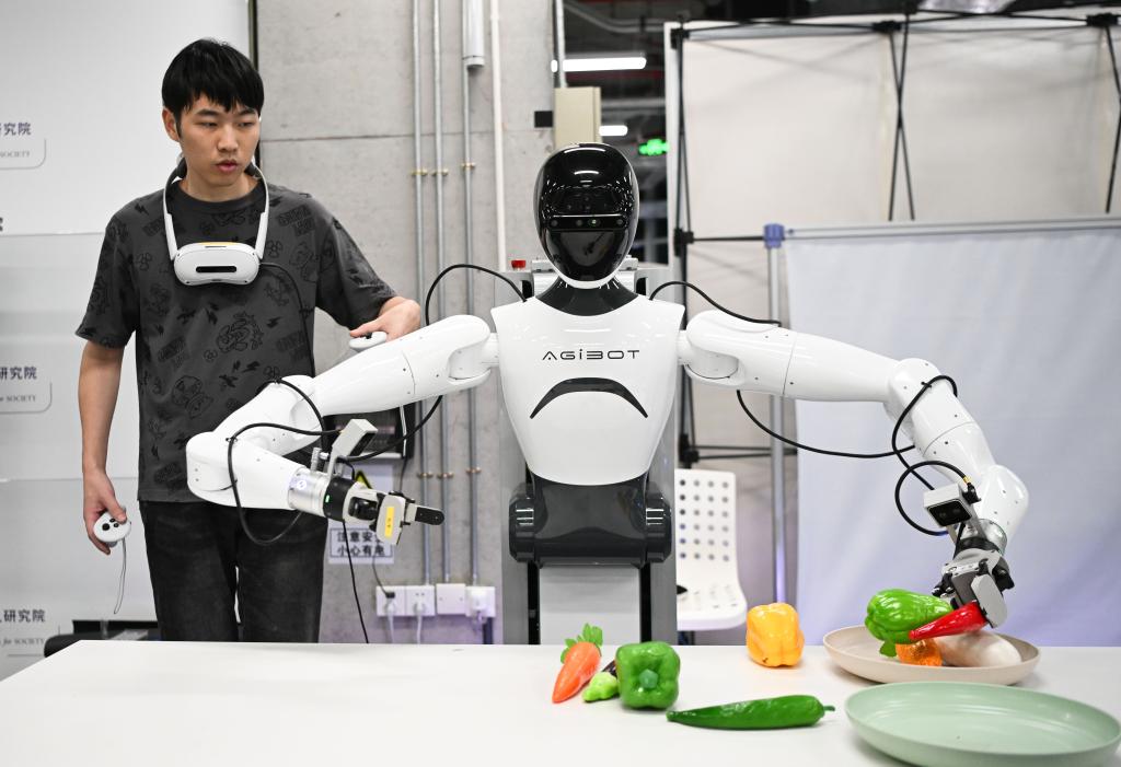广东省具身智能机器人创新中心,工作人员操纵机器人同步动作。 新华社记者邓华 摄