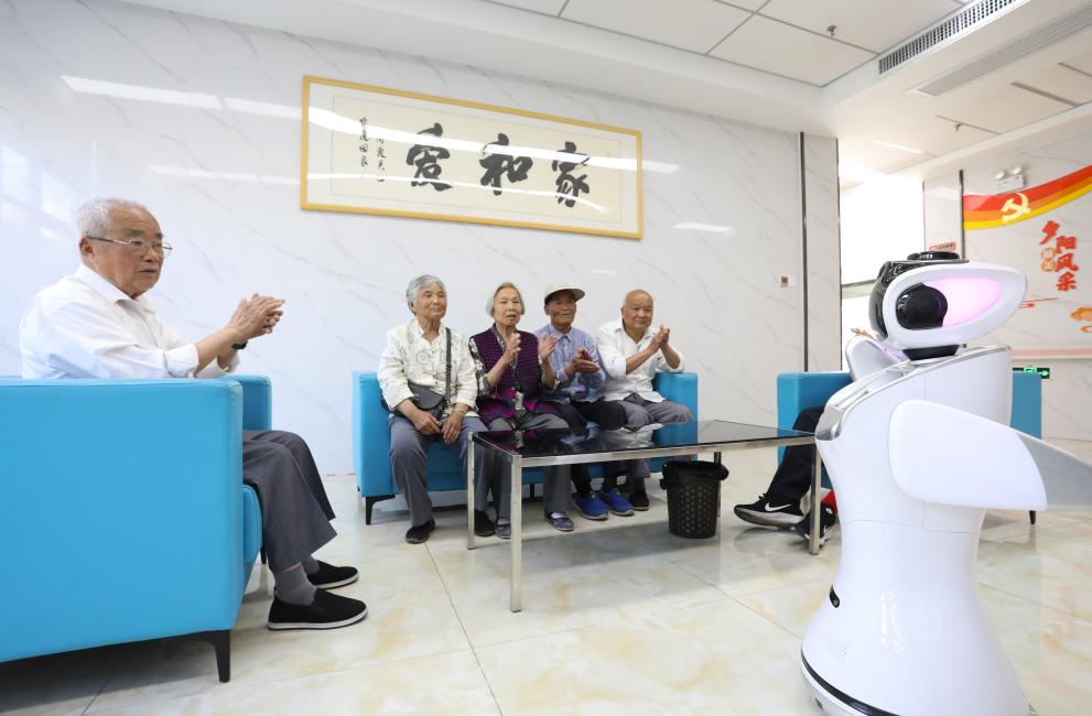 在合肥市肥西县上派镇康和社区爱和家综合性老年活动中心内,智能机器人给老年人播放音乐。新华社发(陈家乐 摄)