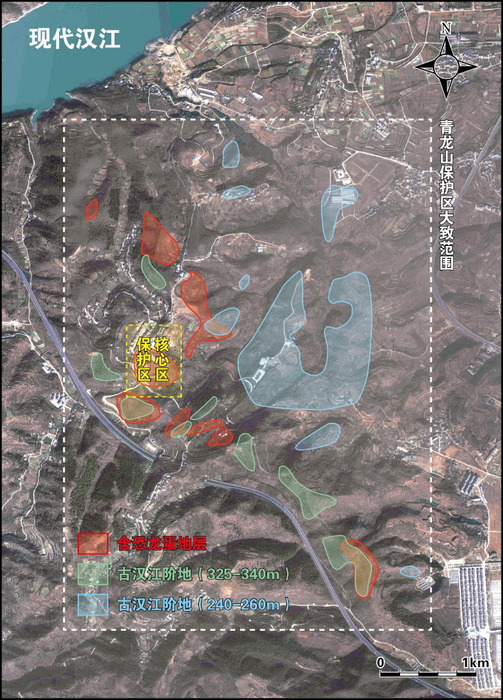 青龙山恐龙蛋化石群保护区古汉江遗迹分布范围示意图。(青龙山保护区地质遗迹调查团队供图)