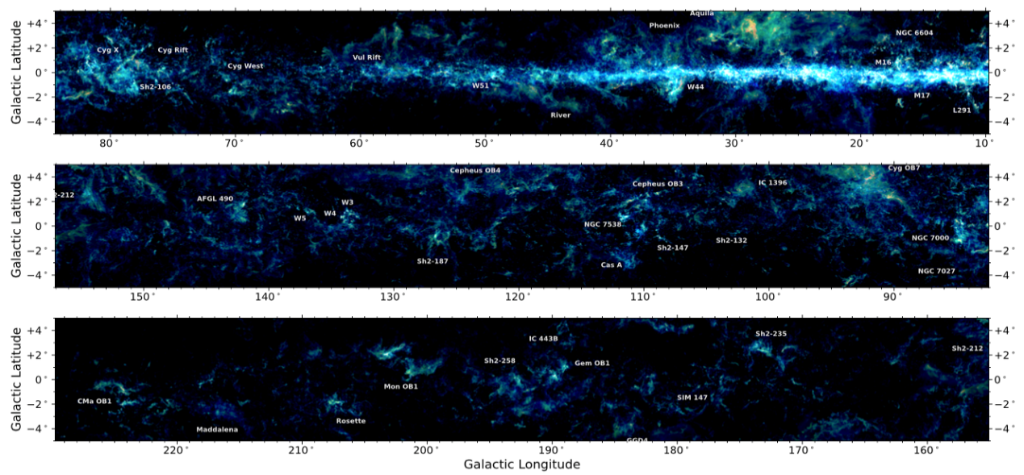 “银河画卷”三种一氧化碳同位素谱线数据合成的红、绿、蓝三色图。图中标识了著名的恒星形成区或气体结构,显示了不同密度环境下的大尺度气体结构和形态各异的分子云细节。(中国科学院紫金山天文台供图)