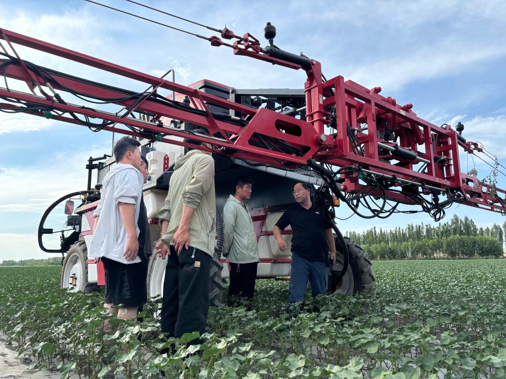 2024年6月28日,温浩军研究员(右一)带领课题组学生进行喷雾机田间试验。(谭明冲 摄)