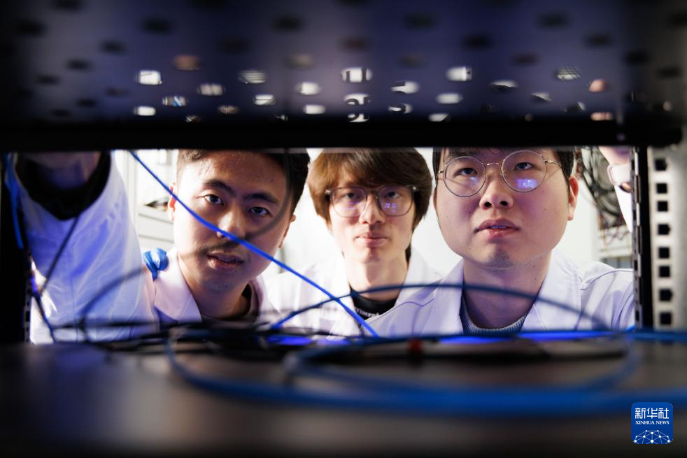 1月21日,在中国科学院物理研究所实验室,共同第一作者刘政和、梁珪涵、刘宇(从左至右)在用示波器检查波形数据。新华社记者 金立旺 摄