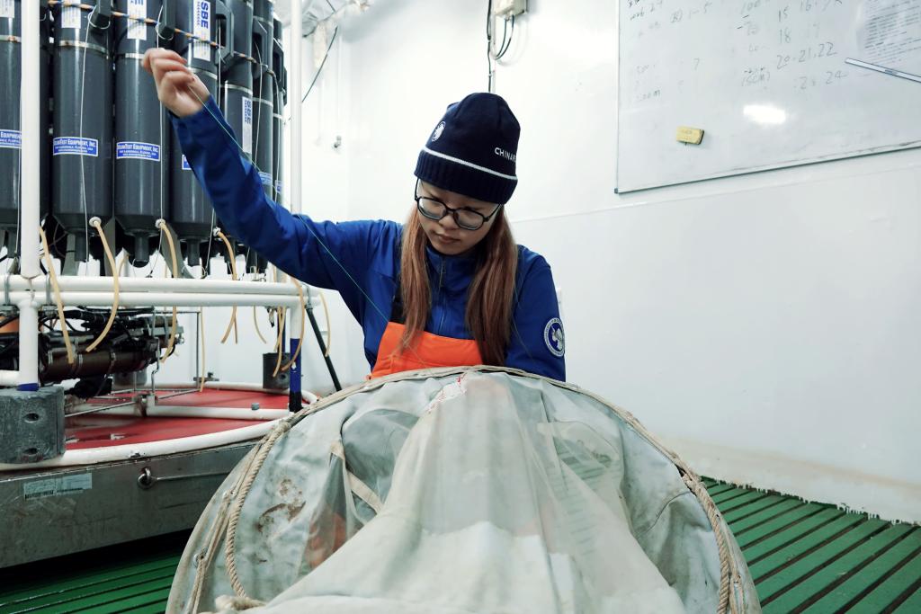 在“雪龙”号实验室,来自中国科学院海洋研究所的“00后”大洋队队员阮亦琳正手拿针线,小心缝补着一面浮游生物拖网。
