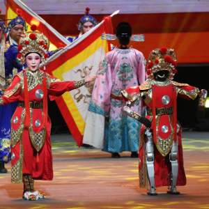 在开场节目《万马奔腾》中,20台机械臂与26台双臂机器人齐挥鼓槌,激昂鼓声奏出奋进节拍。