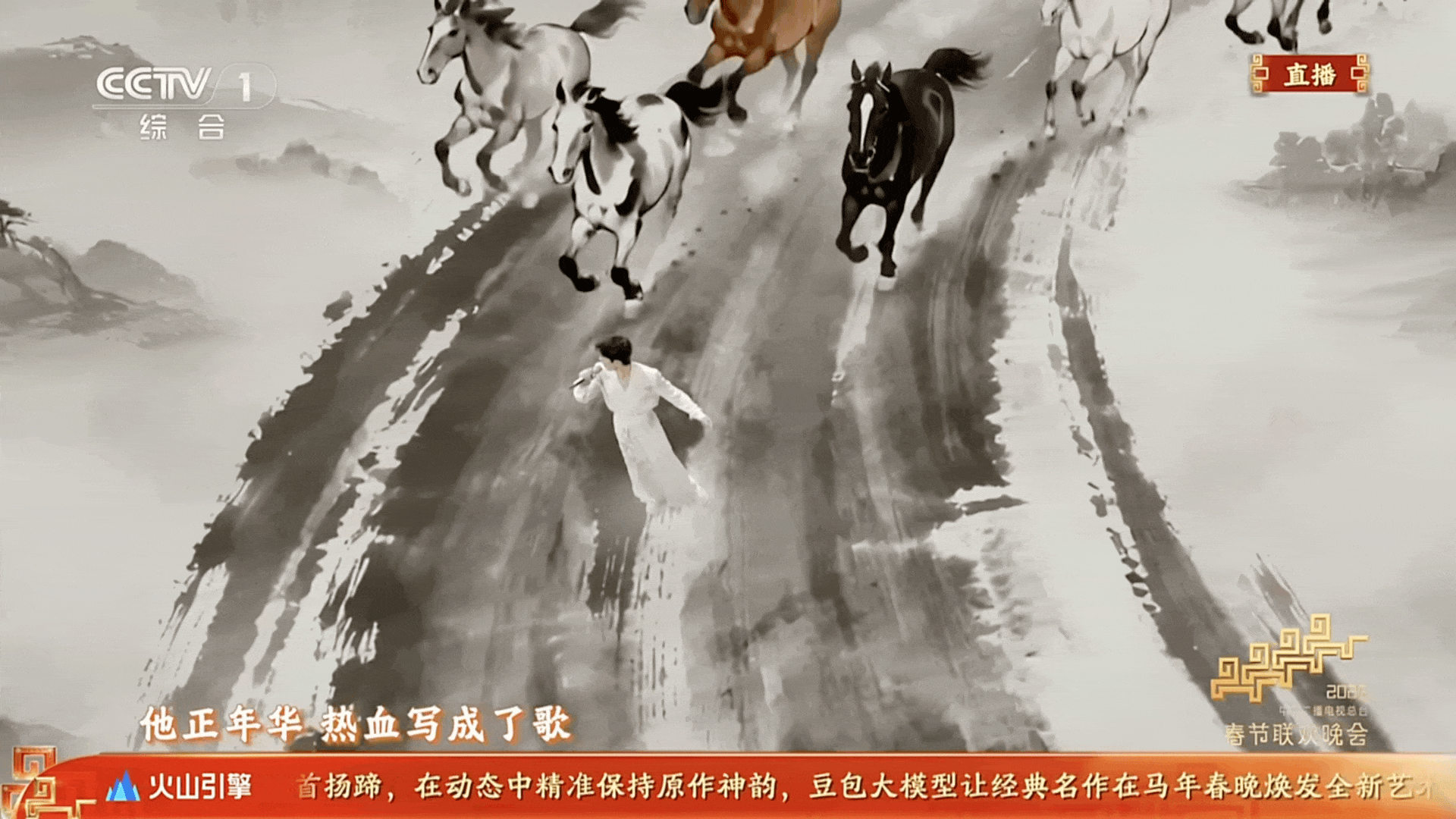 据火山引擎介绍,《驭风歌》节目希望动态演绎国宝级水墨画,Seedance 2.0不仅精准保留了水墨画的笔触、墨韵,还完成了一系列高难度的运动与镜头调度,保证马匹奔跑动作生动自然的同时,也维持了原作的力量感与节奏感。在《贺花神》节目中,该模型又展现了极致的细节把控能力。在蜀葵花和金鱼的制作中,Seedance 2.0为每位演员定制了“一月一人一景,一花一态一观”的视觉奇观,以“AI生成影像+实景舞台扩展”的模式,构建出一种全新的舞台视听叙事结构。
