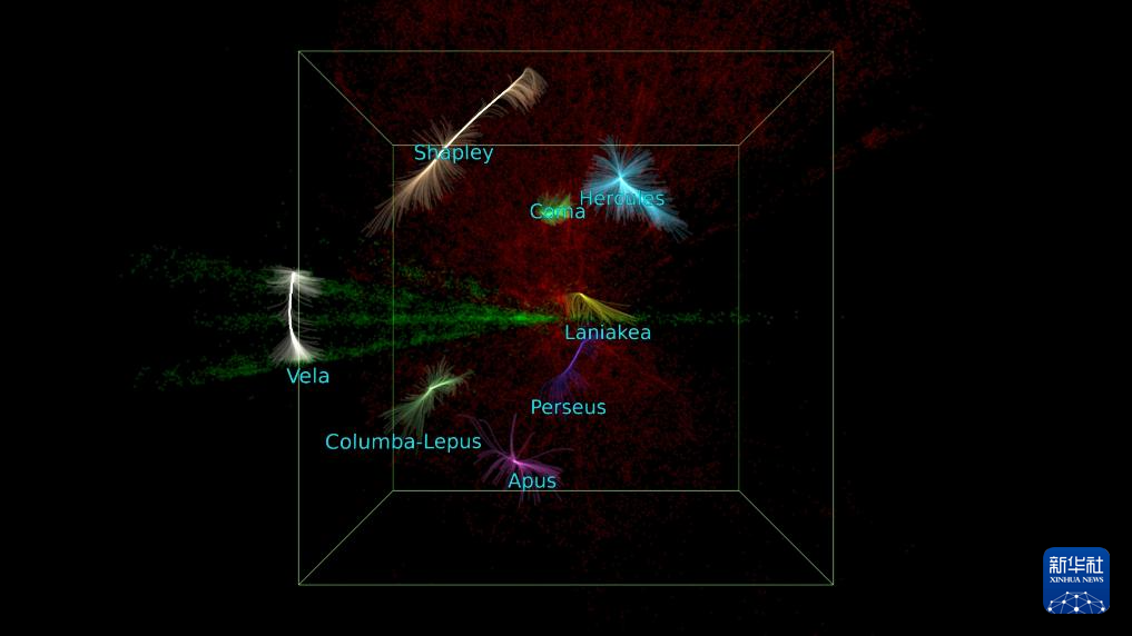 这是附近宇宙主要超星系团分布示意图,左侧为船帆座超星系团。 新华社发(南非开普敦大学供图)