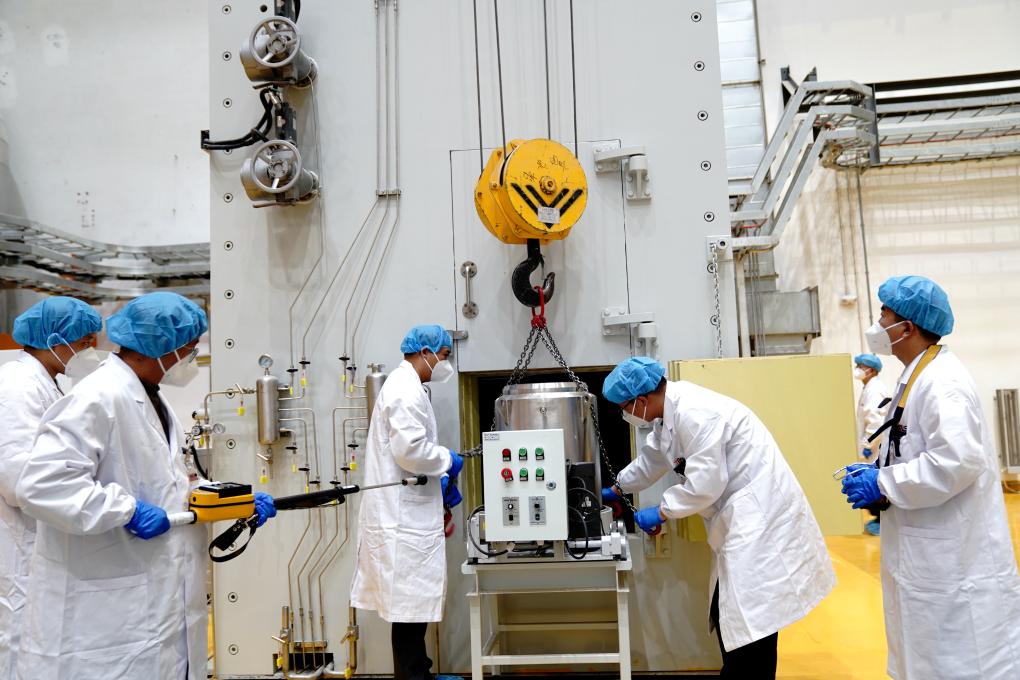 在中国科学院上海应用物理研究所武威园区,科研人员在实验堆加料-取样接口区,从堆内取出燃料盐样品。新华社记者张建松 摄