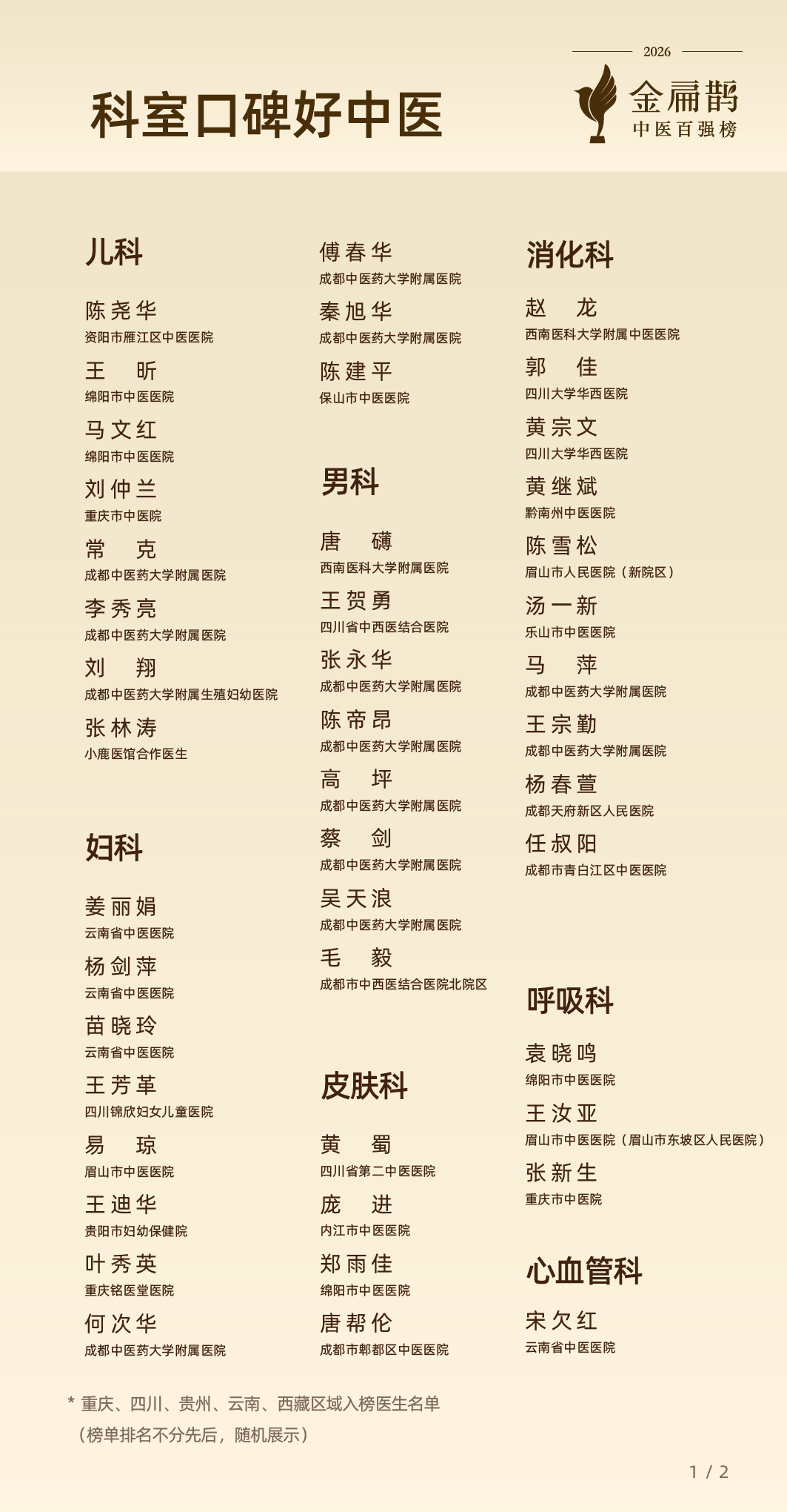 伴随2026金扁鹊中医百强榜于3月26日在北京主会场正式发布,西南地区的中医服务轮廓也进一步显现。西南地区共有78位医生入榜,覆盖重庆、四川、贵州、云南、西藏5个省级行政区中的4个、17个城市,较上届增加10位。