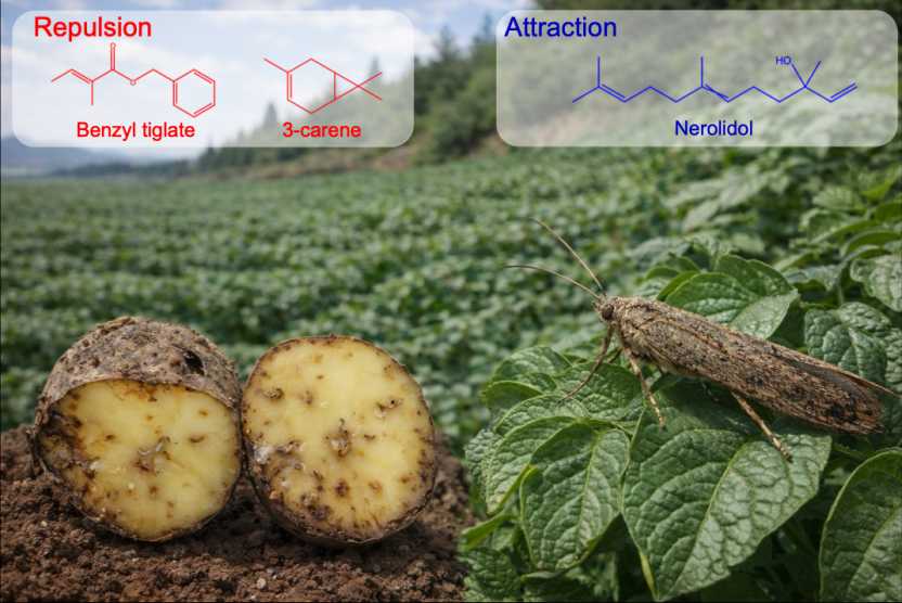 马铃薯块茎蛾(Potato tuber moth, Phthorimaea operculella)是全球茄科作物的重要害虫,是典型的钻柱性害虫,可同时危害田间种植期和贮藏期马铃薯植株或薯块,给马铃薯产业带来严重经济损失。长期以来,马铃薯块茎蛾防控主要依赖化学农药,防效差且存在环境与安全隐患。一系列基于生态学的害虫防控策略应运而生,其中就包括“推-拉”策略(Push-Pull)。“推-拉”策略通过利用植物释放的引诱物和驱避物调控害虫行为,被认为是害虫绿色防控的重要手段。然而,利用栽培品种本身或其释放的引诱物和驱避物构建马铃薯块茎蛾“推-拉”防治策略是否可行?其背后的化学与分子机制一直缺乏系统解析。