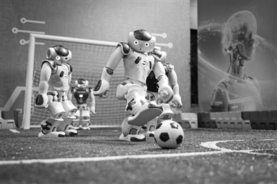 图为人形机器人在湖北省加快建成中部地区崛起的重要战略支点推进大会上表演踢足球。新华社记者 肖艺九 摄